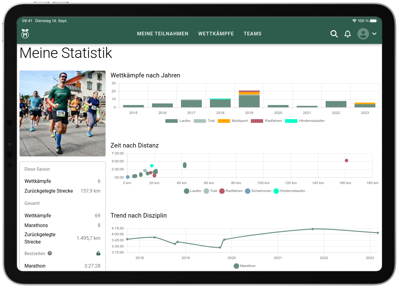Egal ob Dorflauf oder Großveranstaltung: Jeder Wettkampf vervollständigt in deine Statistiken ein Stück mehr. Deine offiziellen Bestzeiten hast du so immer im Blick.